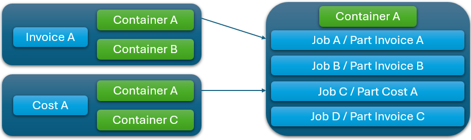 Incoming or outgoing invoices for jobs are automatically distributed among containers, allowing for a more manageable work environment with fewer invoices on the accounting side, while detailed revenue, expense, and profitability can be monitored on the container side.